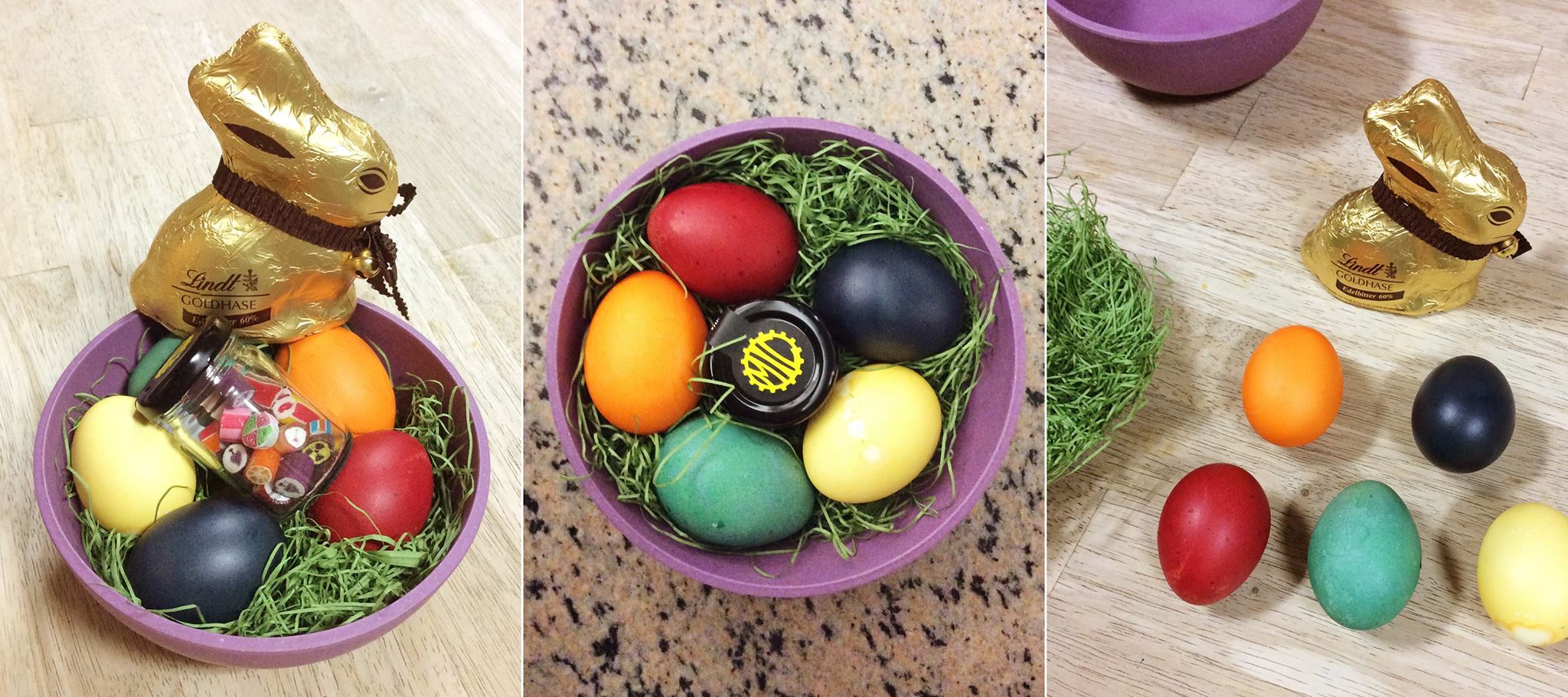 Es ist Ostern und ich wünsche Allen ein schönes Eiersuchfest. Ob mit oder ohne Kind das Färben, Verstecken und dann hoffentlich auch Wiederfinden macht doch jedem Spass. Wie schon in den vergangenen 2 Jahren, habe ich auch in diesem wieder einige Osterkörbe vorbereitet und an Familie (von Silver) und Mitbewohner verteilt. Diese Kleinigkeiten aus bunt gefärbten Eiern und einigen schokoladigen Süßigkeiten sind bis jetzt immer gut angekommen.