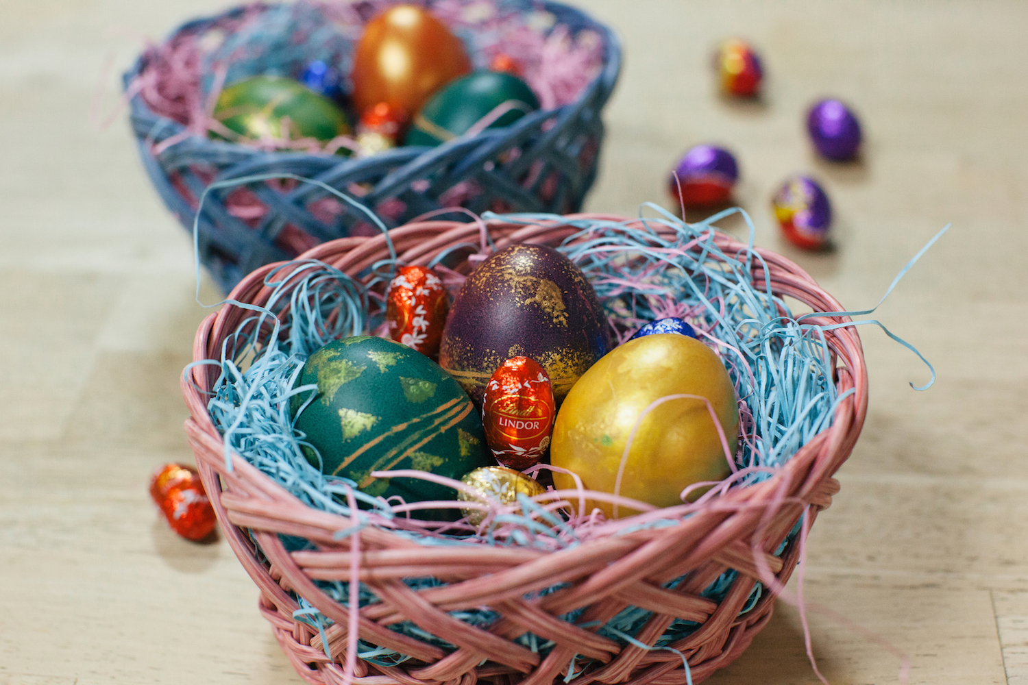 Im vergangen Jahr habe ich dann die Gummibandtechnik zum Akzentuieren des gefärbten Eies eingesetzt. Wie das funktioniert und mehr Bilder aus 2015 habe ich damals schon in einem Blogeintrag verpackt. In diesem Jahr habe ich diese Technik wiederum aufgegriffen, aber die Eier zusätzlich nach dem Färben mit Gold 👑 überzogen. Anschließend wurden die Eier dann in Dreiergruppen in ein sanftes Bett aus Ostergras gebettet und mit schokoladigen Lindor Freunden umgeben.