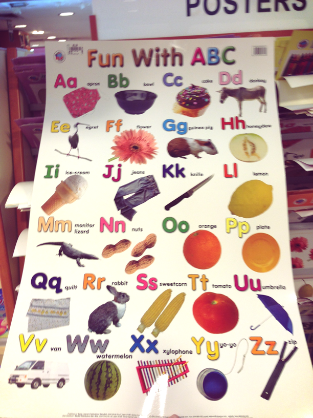 Dort habe ich in der Posterabteilung eigentlich ein Pinying-Poster gesucht um meinem Chinesisch etwas auf die Sprünge zu helfen. Leider habe ich das nicht gefunden, aber dafür folgendes Poster um Kindern das ABC beizubringen.