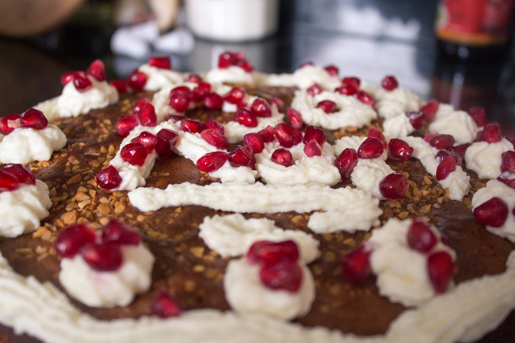Nachdem ich fertig war und den Kuchen einen Moment aus den Augen gelassen hatte, ist leider ein Granatapfelüberfall geschehen und bevor ich mich versah war der ganze Kuchen mir ihren Kernen verziert.